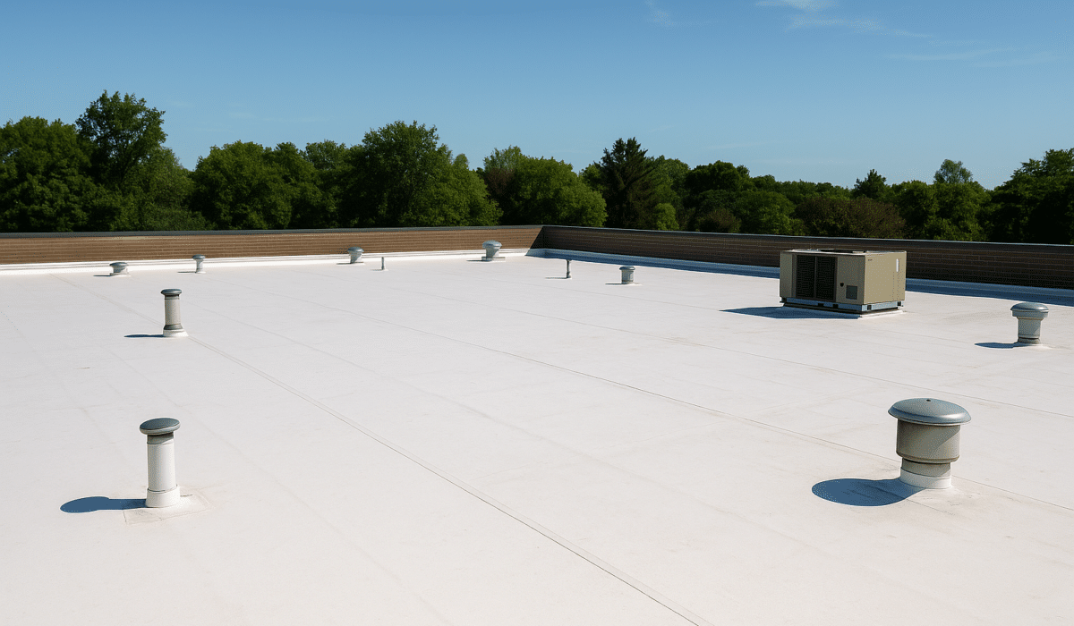 TPO (Thermoplastic Polyolefin): A highly reflective, heat-welded system that enhances energy efficiency and reduces cooling costs for large commercial buildings.